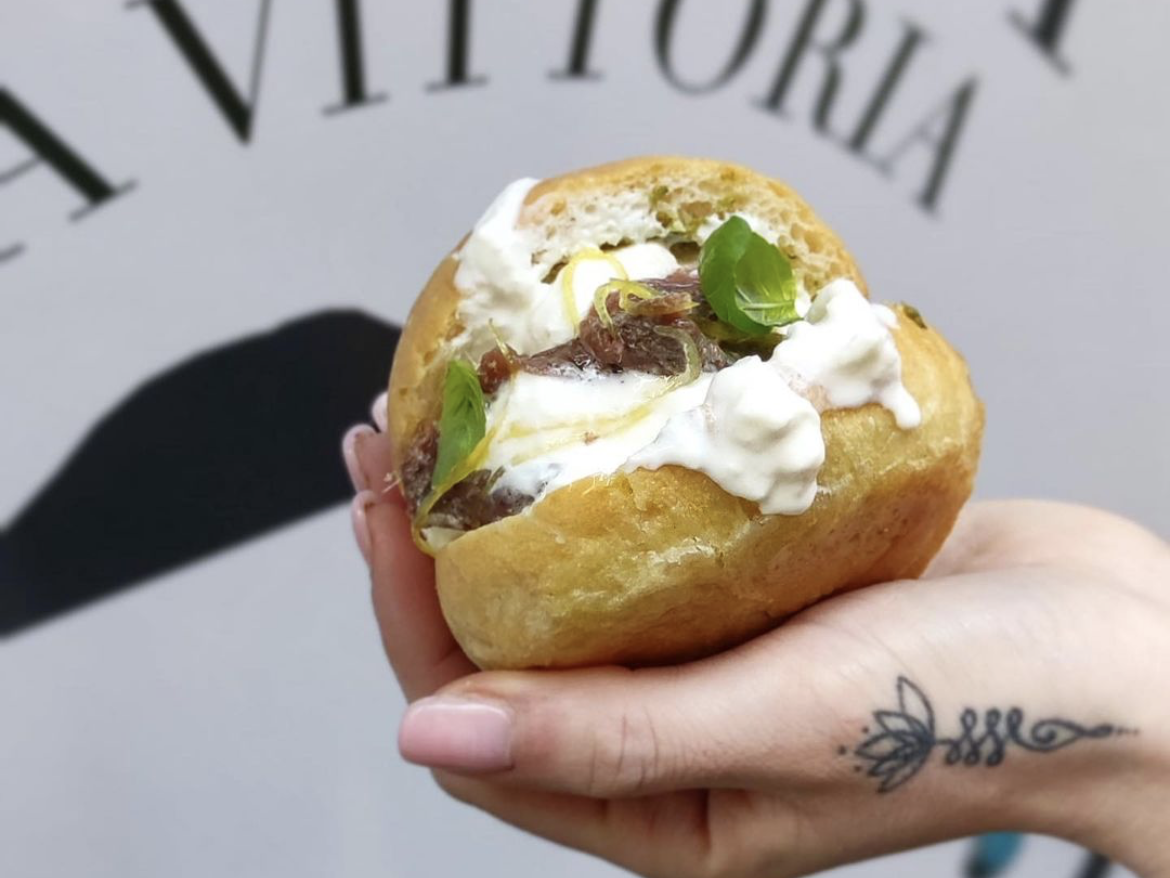A Bumba – Focaccetta ligure imbottita con pesto fatto in casa, stracciatella di burrata, zest di limone del Golfo candito, acciughe del Cantabrico e basilico di Pra