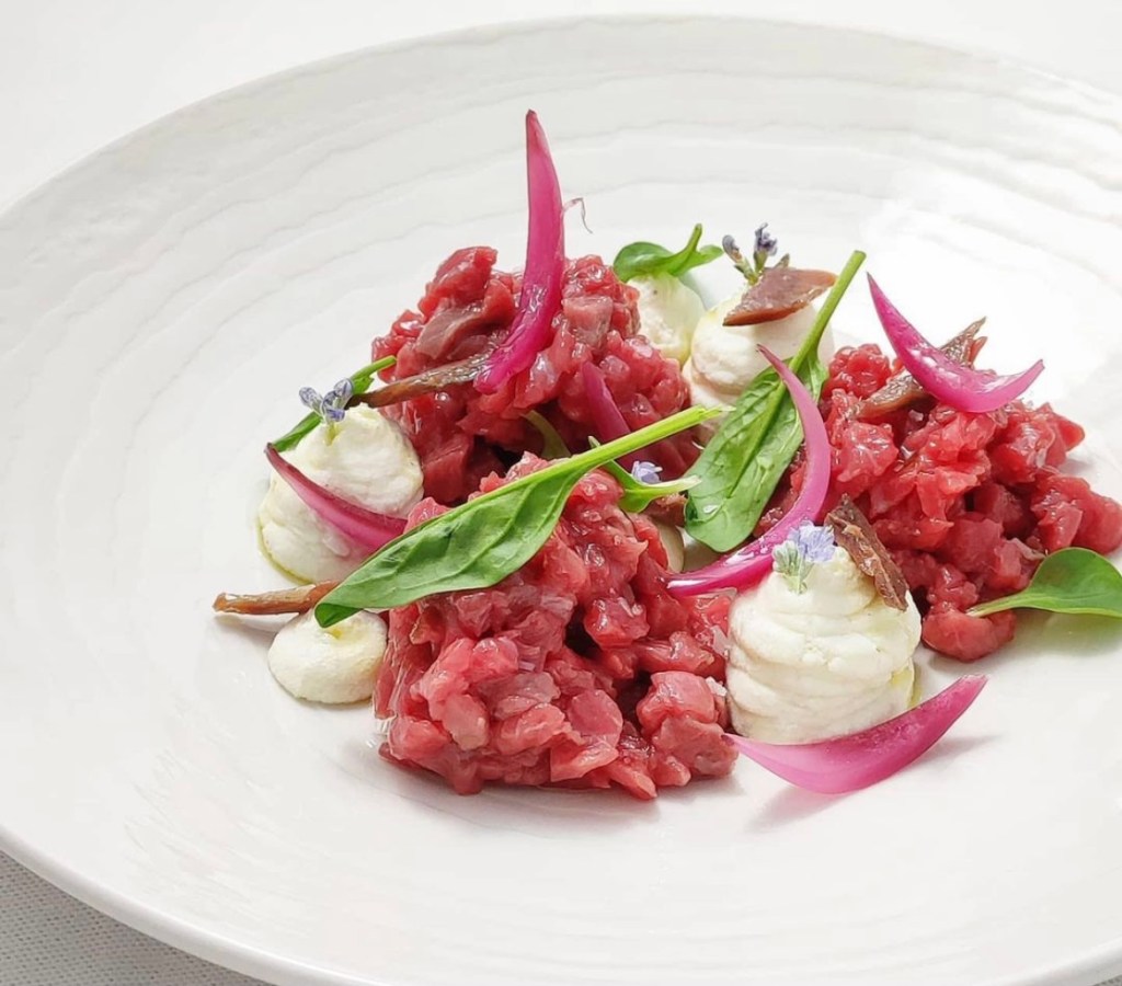 Beato tra le donne – Cruda di manzo al coltello, crema di ricotta di pecora Brigasca (Presidio Slow Food), cipolla rossa di Tropea marinata all’aceto di lampone e acciuga del Cantabrico