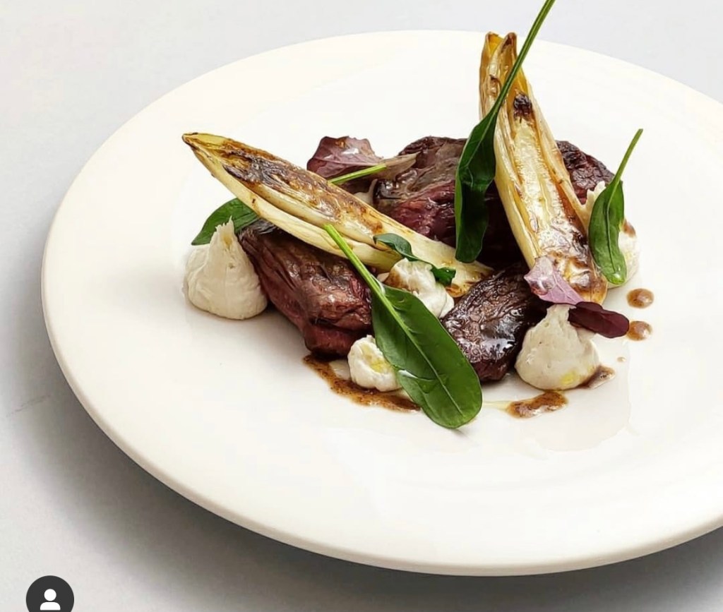 Fumo – Diaframma alla brace e il suo fondo, con invidia belga arrosto e robiola di Roccaverano (Presidio Slow Food)